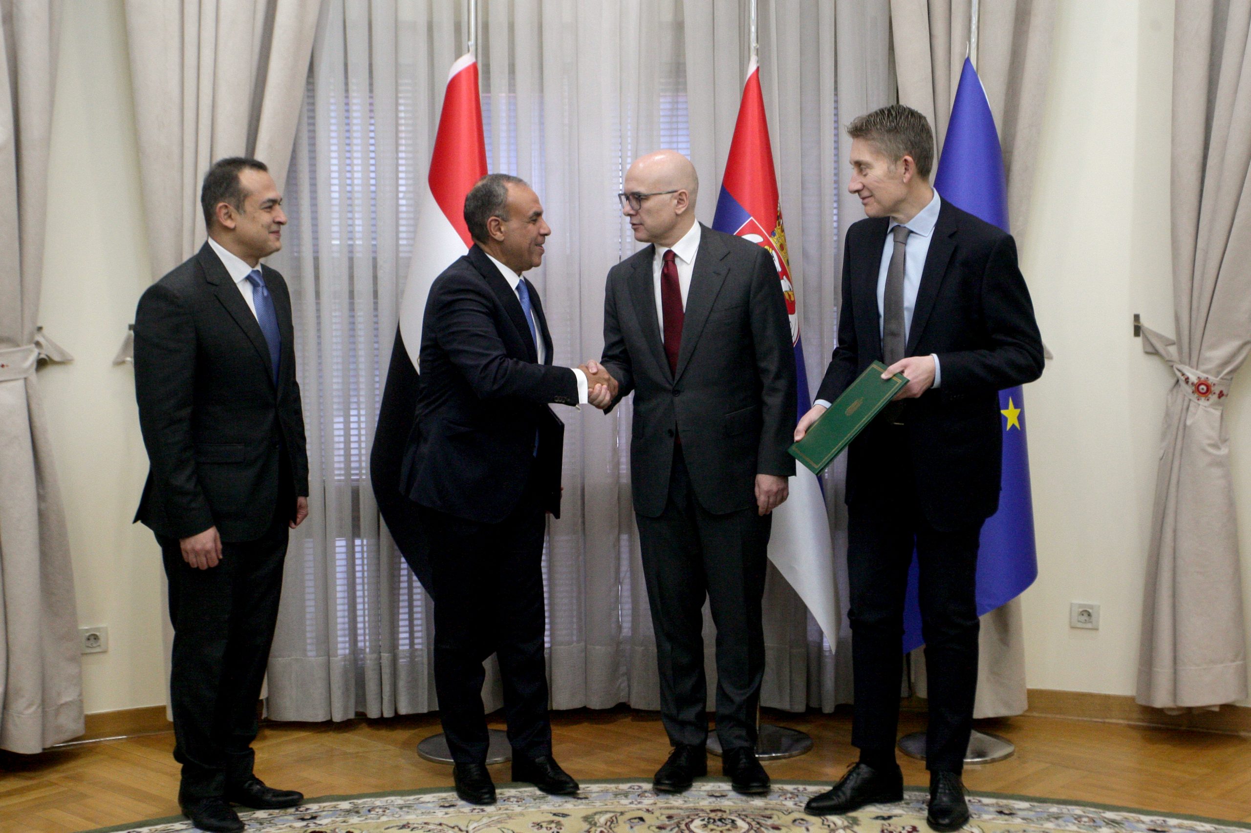 - Beograd, 22. januara 2025. – Predsednik Vlade Republike Srbije Milo Vuèeviæ sastao se sa ministrom spoljnih poslova Arapske Republike Egipat Bedrom Abdelatijem. Ovom prilikom Ministarstvo poljoprivrede, umarstva i vodoprivrede Republike Srbije i Ministarstvo vodnih resursa i navodnjavanja Arapske Republike Egipat potpisali su Memorandum o razumevanju u oblasti vodnih resursa i navodnjavanja. Sastanku su prisustvovali Aleksandar Martinoviæ, ministar poljoprivrede, umarstva i vodoprivrede i Basel Salah, ambasador Egipta u Srbiji. FOTO TANJUG/ SAVA RADOVANOVIÆ/ bs